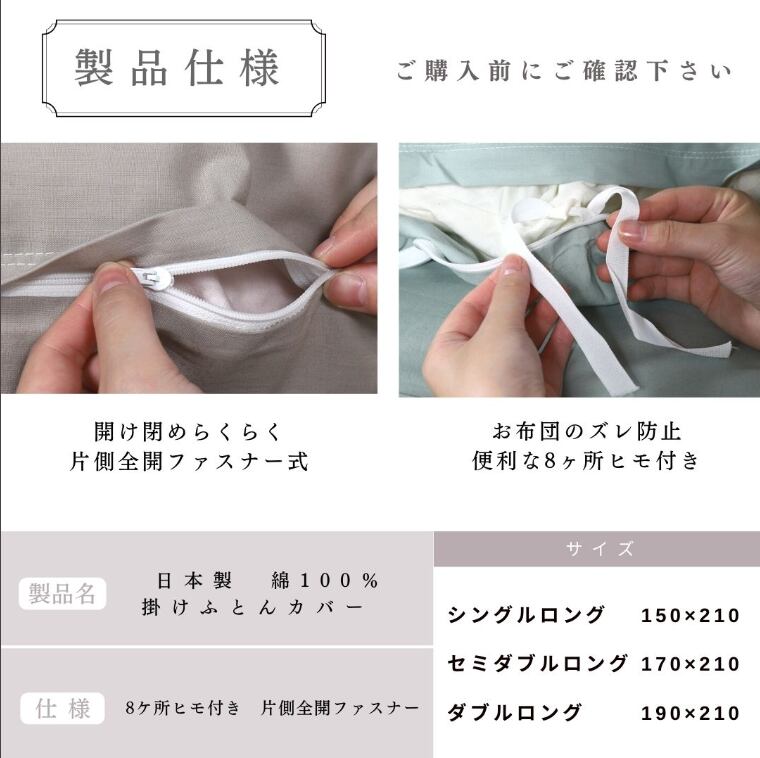 掛けふとんカバー 190㎝×210㎝ 綿100% 日本製【選べる8カラー】(090701グレー)