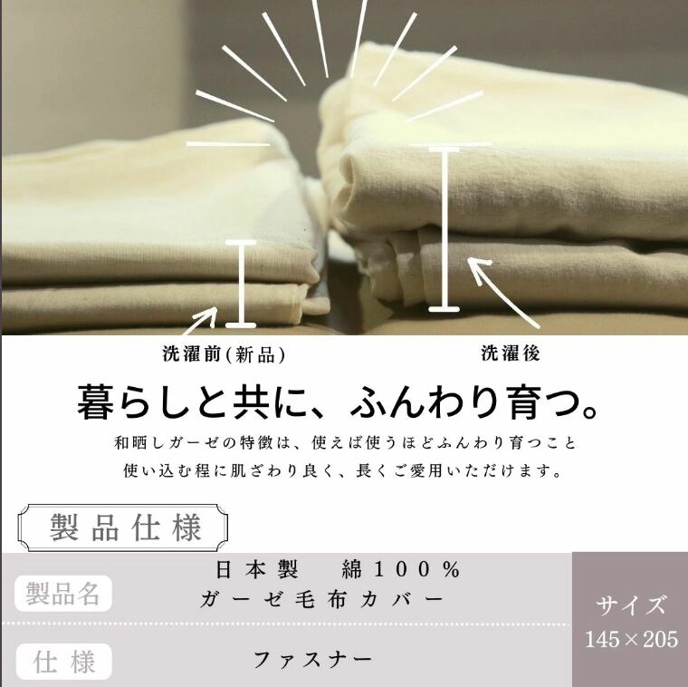 安心の日本製・綿100%和晒し加工ガーゼ生地を使用した毛布カバーです。
