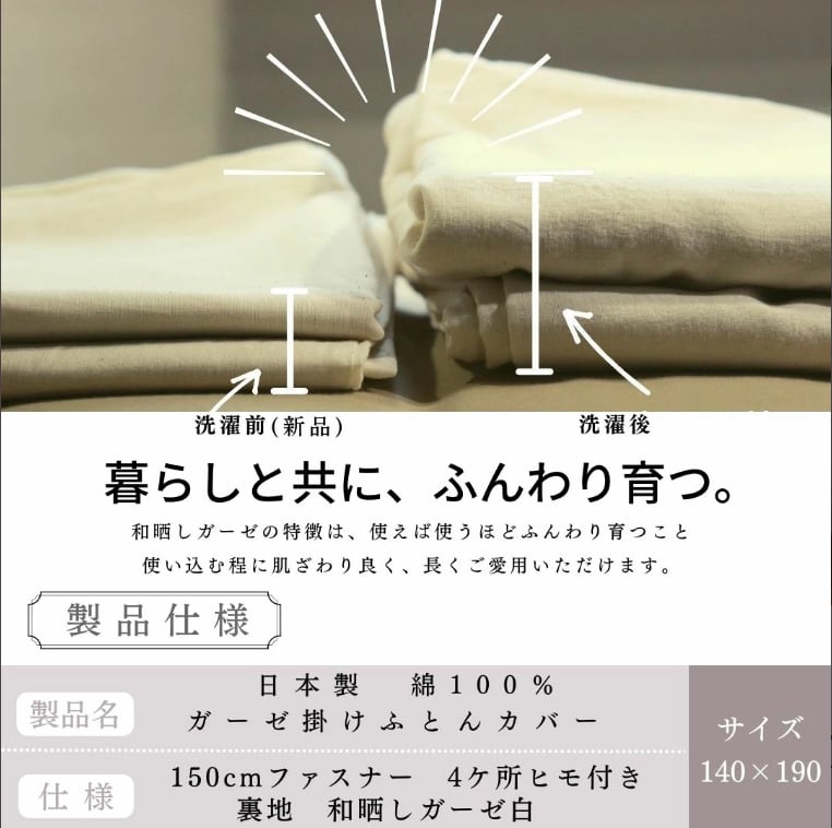 安心の日本製・綿100%和晒し加工ガーゼ生地を使用した掛けふとんカバーです。