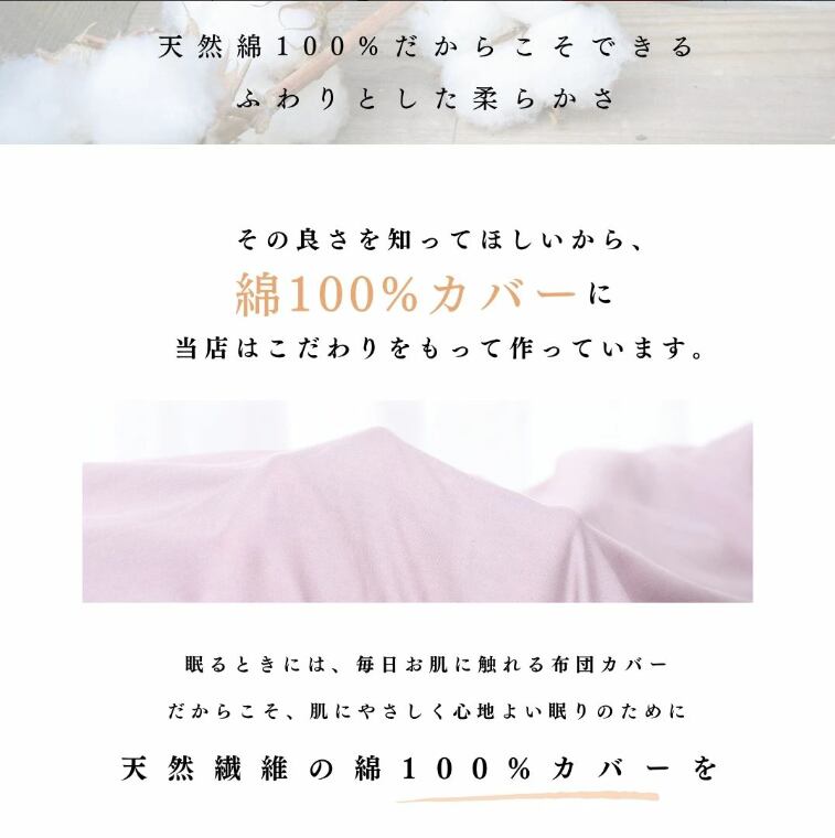 安心の日本製・綿100%生地を使用したお肌にやさしいふとんカバーです。